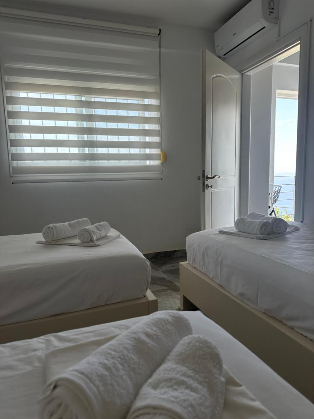 At the hotel, rooms are fitted with a wardrobe and a balcony with a sea view. The rooms in Nostos Palase are fitted with a flat-screen TV and a hairdryer.