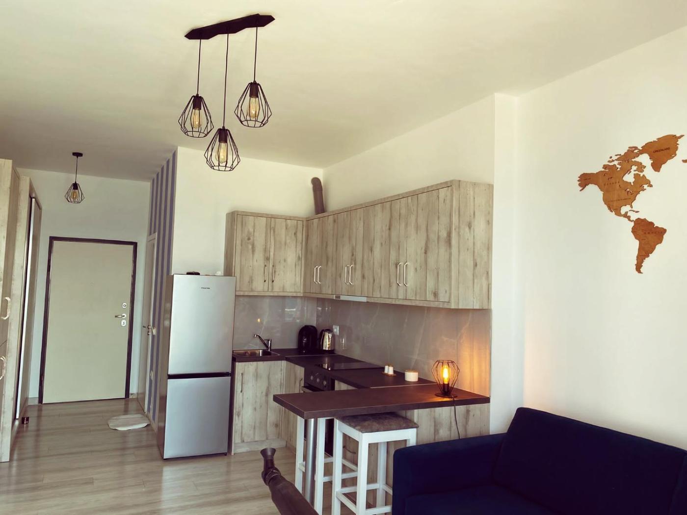 Studio Apartment with Sea View. This air-conditioned apartment comes with 1 living room, 1 separate bedroom and 1 bathroom with a shower. Guests can make meals in the kitchenette that features a stovetop, a refrigerator, kitchenware and an oven. Boasting a balcony with sea views, this apartment also features a washing machine and a flat-screen TV with streaming services. The unit has 1 bed.